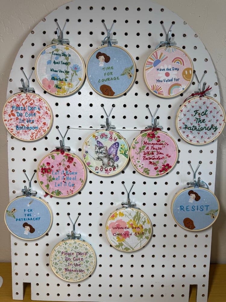 4 inch embroidery on random vintage or reclaimed fabric
